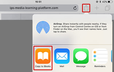 3. Tap on the square icon on the top of the toolbar and tap on "Copy to iBooks" icon. On iPhone, you will find the icon at the bottom.